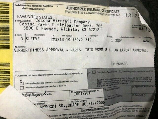 CESSNA SLEEVE P/N CM3213-10 8130-3 10′ FOOT ROLL FN # 11067
