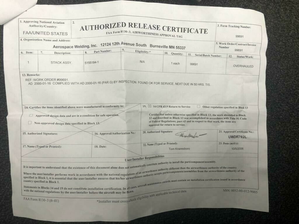 EXHAUST STACK P/N 5155184-1 OHC 8130-3 # 11837OVER 10 MILLION PARTS IN INVENTORY ALL SALES FINAL, NO RETURNS, UNLESS AUTHORIZED RUSH ORDER TAKEN ON THIS ITEM   SAME DAY SHIPPING FOR ORDER PLACED BEFORE 2PM EST, AFTER 2PM EST NEXT DAY, MONDAY-FRIDAY TRACKING NUMBERS WILL APPEAR THAT DAY PRODUCTS MUST BE PAID IN FULL   ANY INTERNATIONAL DUTY AND TAXES MUST BE PAID BY CUSTOMER; AT TIME OF DELIVERY OF PRODUCT OVERSEAS BUYERS ARE SUBJECTED TO THE ADVERTISING COST    INCURRED BY SENDING TO A USA FREIGHT COMPANY   Ebay Payments:  You will be receiving a link to make your payment from “EBAY” to the email address on file with ebay shortly. Products will ship after payment received. If for some reason you don’t see your invoice within 30 minutes of purchase, please check your SPAM BOX  thank you for shopping at shop aviation store.  Shopaviatonstore com  954  319   0936